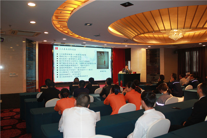 会上,宾馆安全专员方毅向全体义务消防员详细介绍了三元宾馆现有的消防设施设备,对火灾探测器的种类、报警系统、卷帘门和防火门的类型、消火栓的组成等消防设备进行了培训,对灭火器、灭火毯、消火栓的使用方法进行了讲解和演示。