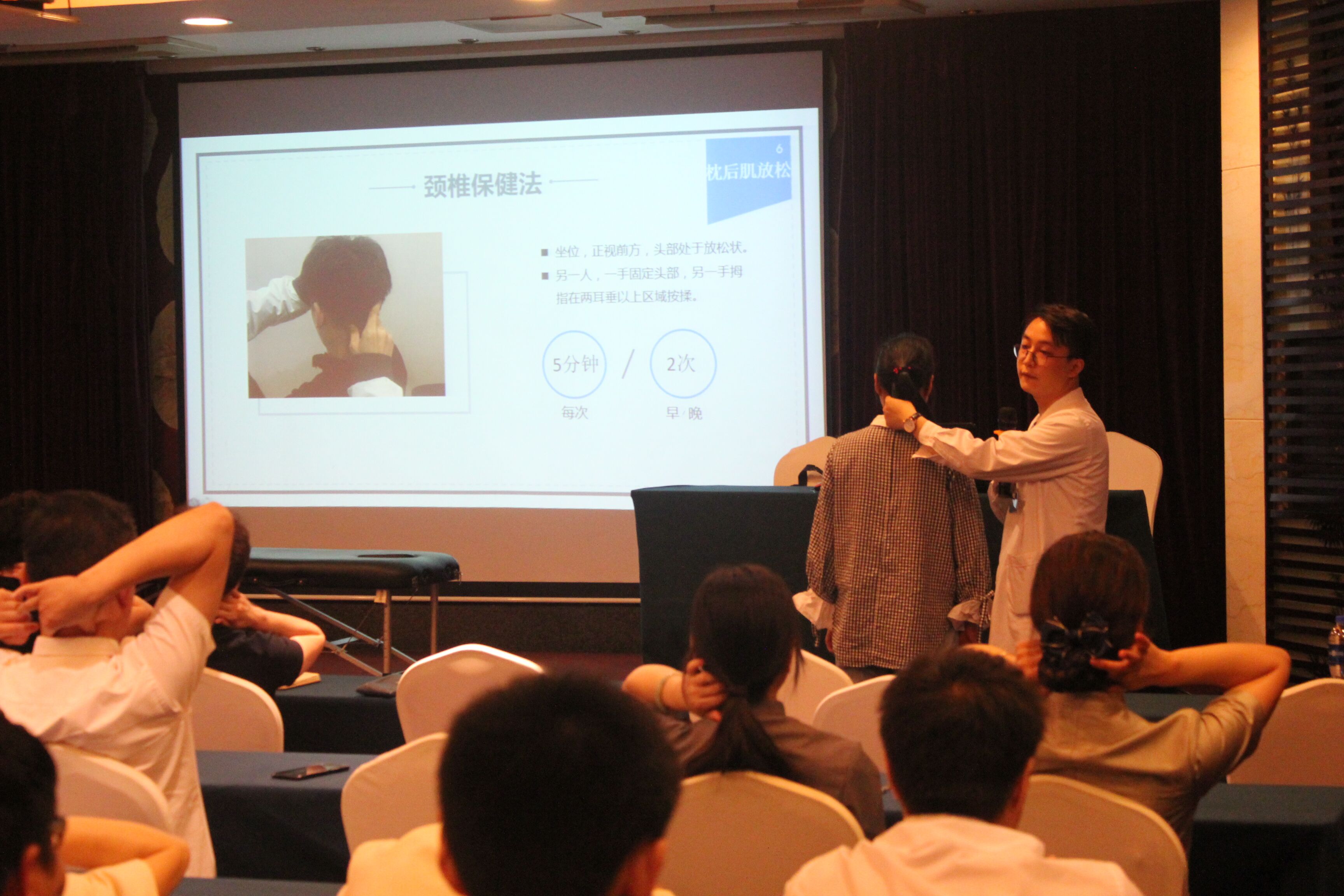 翁主任和张主任运用丰富的医疗知识和实践工作经验,针对大家工作、生活中的实际情况,着重从办公室保健和颈腰椎疾病防治等方面,结合多年临床经验,深入浅出地讲解了颈肩综合症、腰椎病等,并现场教大家颈椎日常保健操、以及预防方法等。