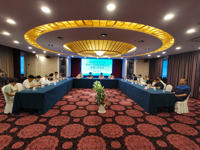 7月27日下午,学院附属苏州三元宾馆在宾馆多功能厅召开2022年上半年度管理工作会议,宾馆领班以上管理人员参加会议,资产经营公司党总支书记卞瑾、总经理俞险峰出席会议,总经理助理查以忠主持会议。