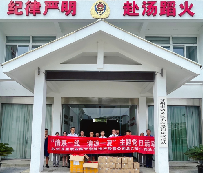 8月11日上午,资产经营公司党总支第一党支部组织全体党员开展了“情系一线  清凉一夏”送清凉主题党日活动。连日高温,骄阳似火,而在这炎炎夏日的阳光下,却有一股清凉的风沁人心扉,姑苏区苏站路消防救援大队的大门前,出现了一幕温馨的画面,我校资产经营公司党总支第一党支部的党员们在支部书记朱伟带领下,车载满满的防暑降温用品和矿泉水,为坚守岗位的消防英雄们送上了夏日的清凉。